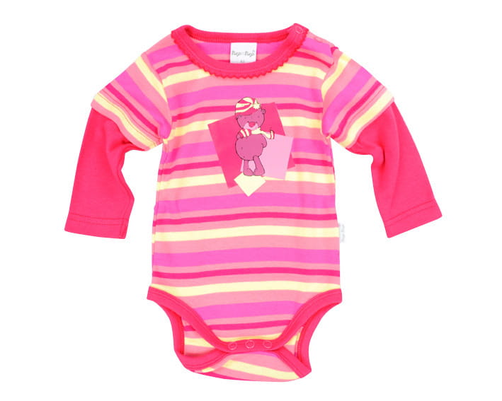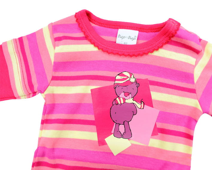 Body niemowlęce marki Tup-Tup. Kolor różowy. Zapinane przy szyi i w kroku na estetyczne napki. Z przodu aplikacja z sympatycznym misiem. Skład: 100% bawełna.